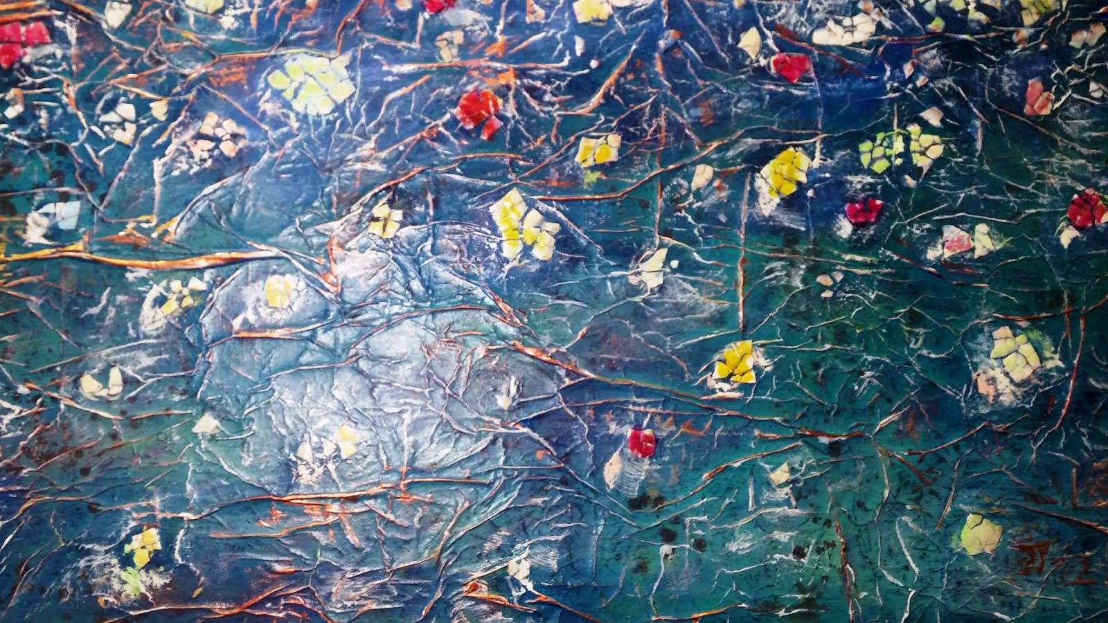 Duzy akrusz szarego papieru najpierw zgniotłam, następnie nakleiłam na kanwę, po czym pomalowałam tło"